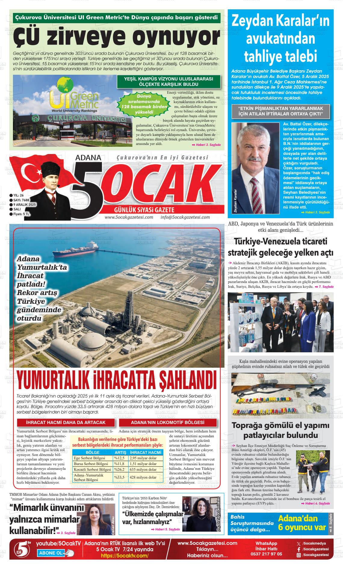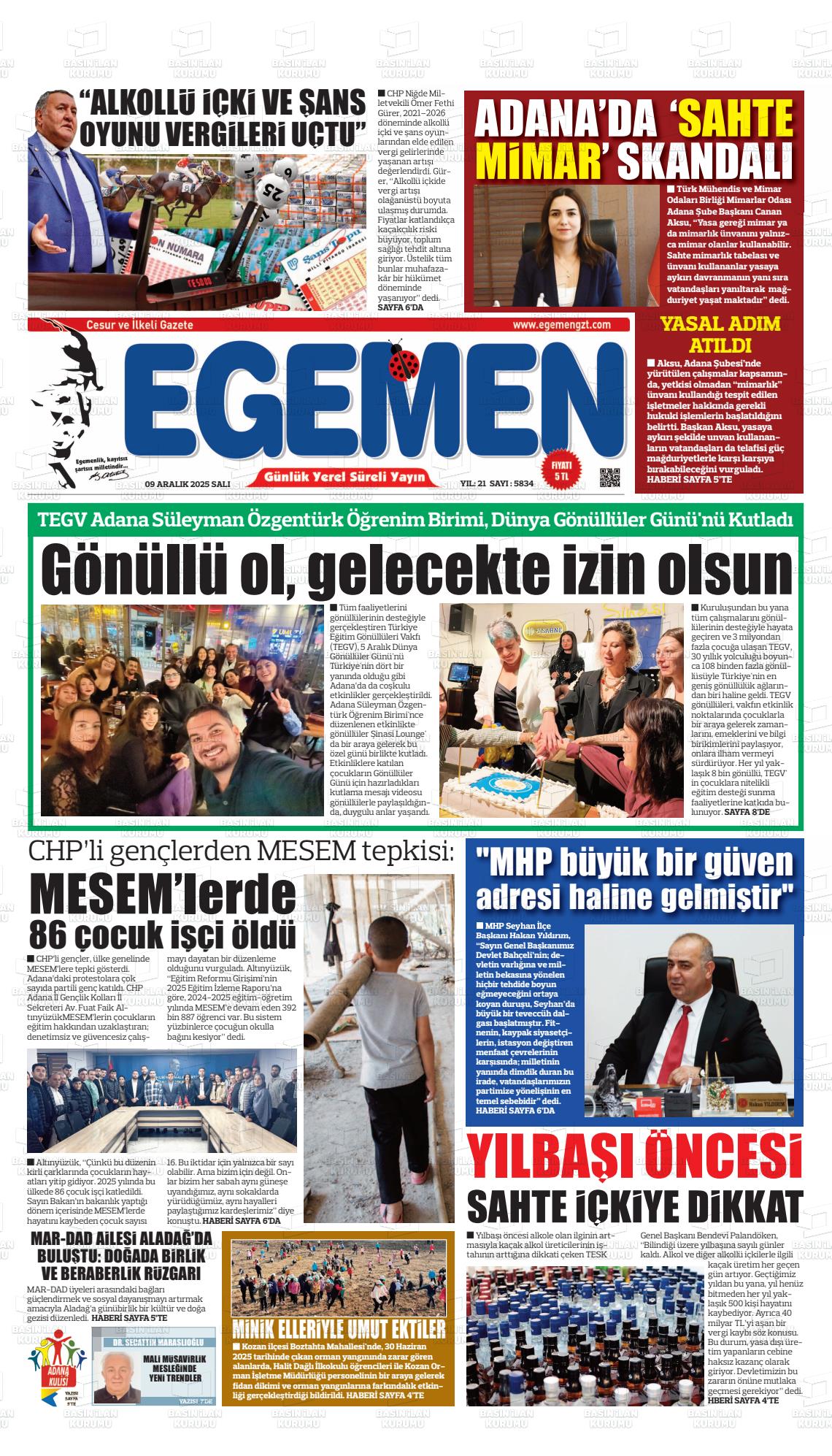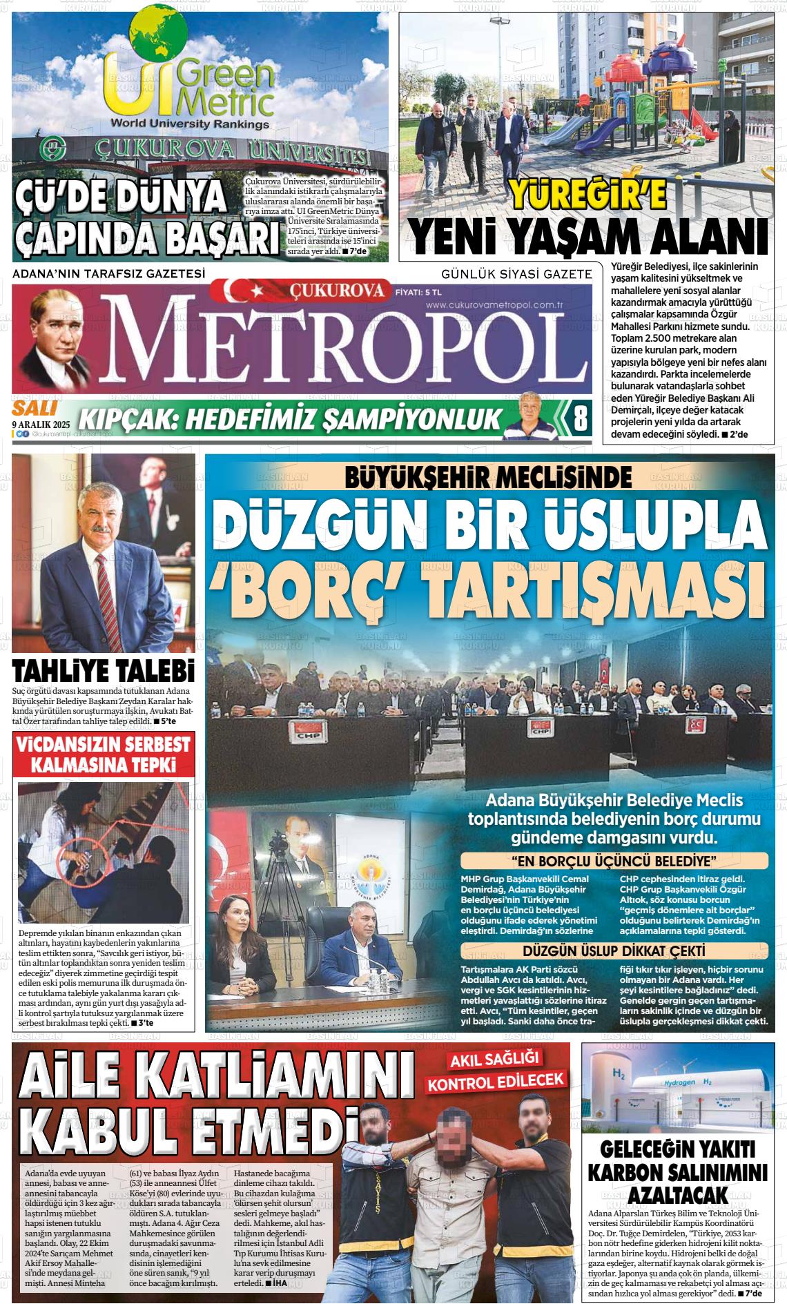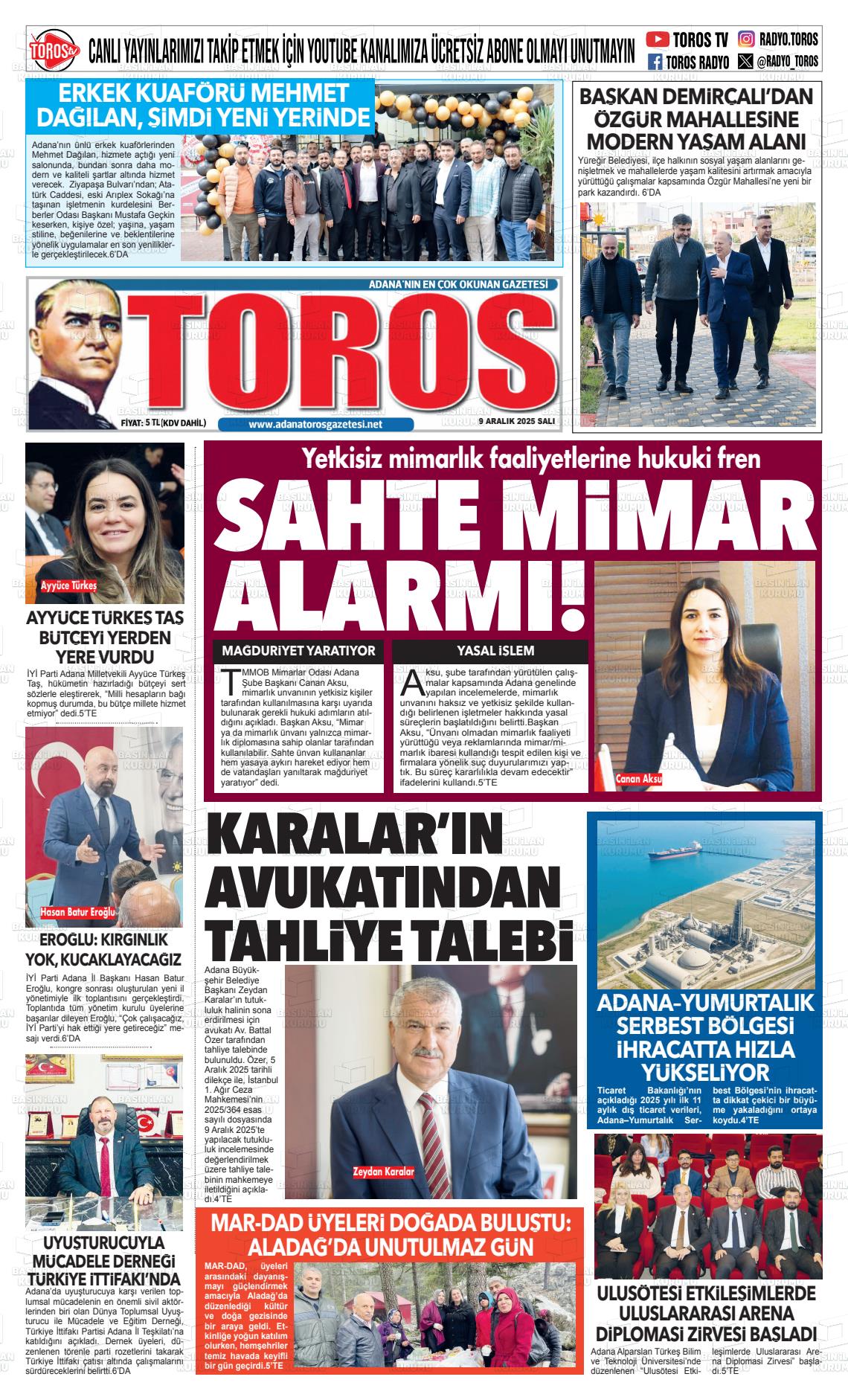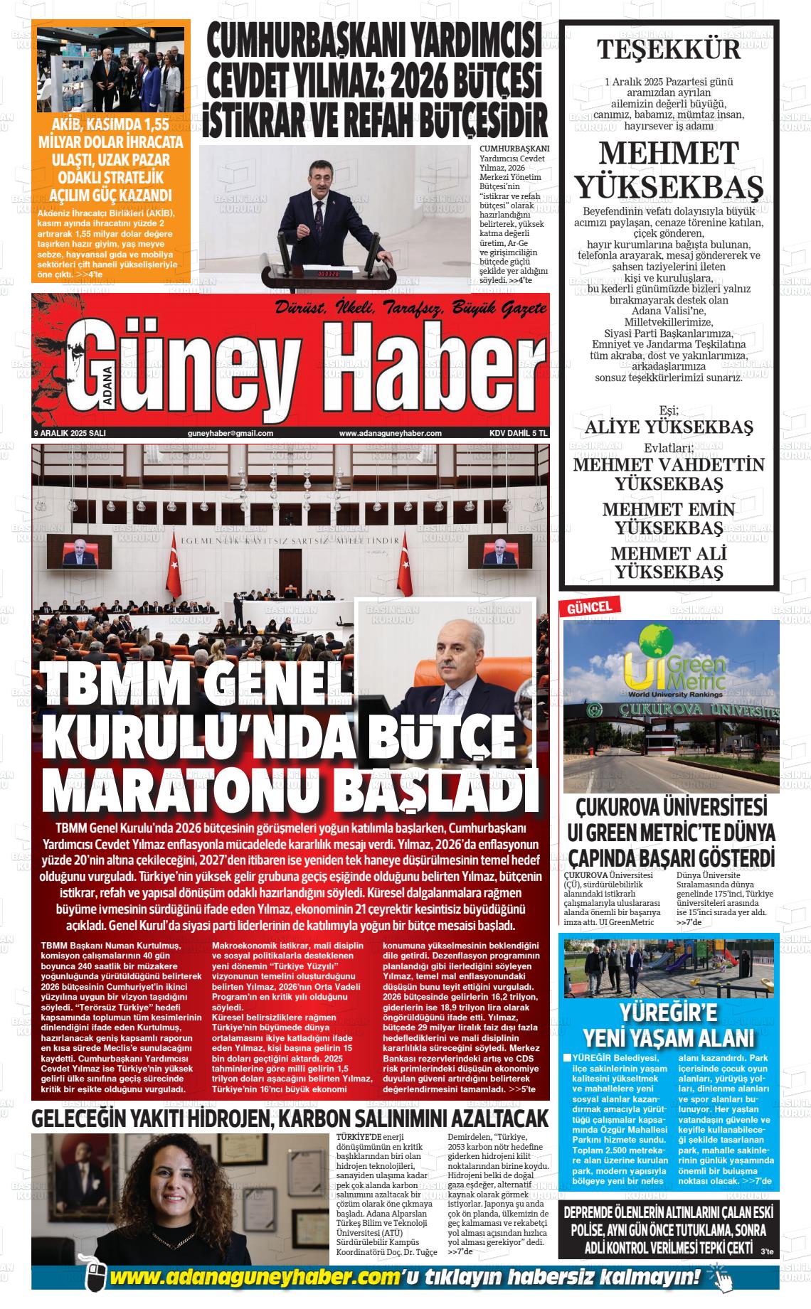 Adana Yerel Gazeteleri 10 Aralık 2025, Çarşamba Günü Manşeti