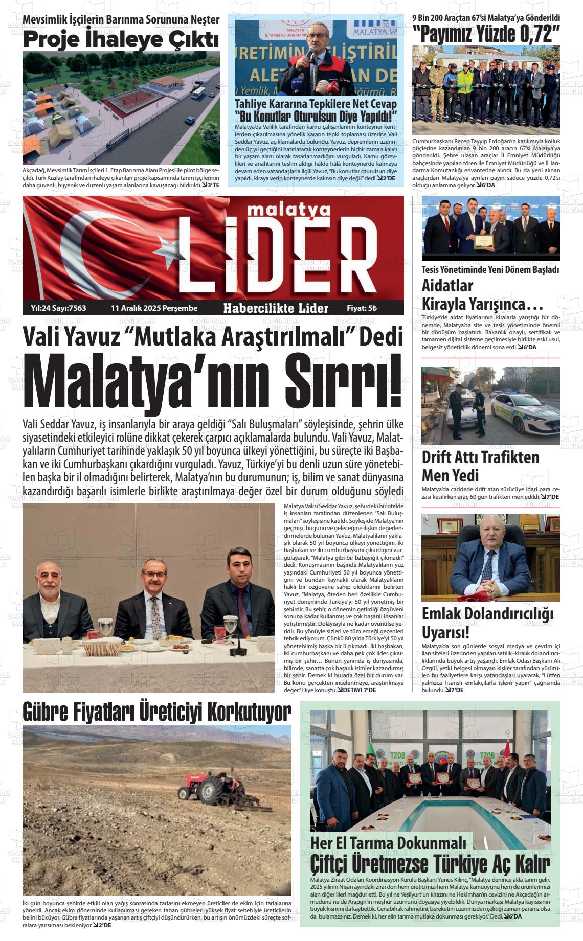 Malatya Yerel Gazeteleri 11 Aralık 2025, Perşembe Günü Manşeti